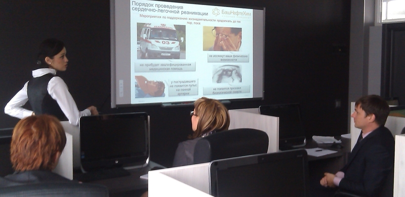 March 19-20, 2014 - the educational center "Bashneftehim" held two workshops in order to discuss new visuals specially designed for the training of "Bashneft" employees. The "Occupational Health and Safety" and "First Aid (acc. to JSOC "Bashneft" standards)" slides were shown to the representers of the oil company. The customer oil company "Bashneft" delegated Ruslan Husainov (The Occupational Health, Industrial Safety and Ecology Department manager), Mihail Janchenko (The HR Development and Motivation Department Manager), Vladimir Morozov (Chief-engineer of theOccupational Health, Industrial Safety and Ecology Department) to the meetings.