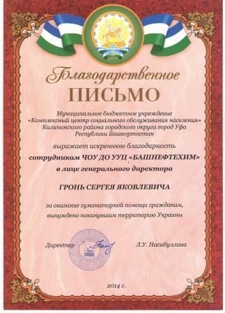 Сотрудники учебного центра "Башнефтехим" приняли активное участие в сборе гуманитарной помощи для беженцев из Украины.1 августа 2014 Сотрудники учебного центра "Башнефтехим" приняли активное участие в сборе гуманитарной помощи для беженцев из Украины. В качестве помощи были отправлены одежда, обувь, постельное белье, продукты питания длительного хранения, бытовая химия и другие необходимые принадлежности.