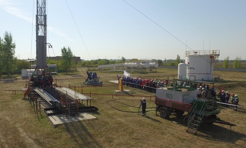 Смотр-конкурс «День обмена опытом» в Дюртюлинском филиале22 августа 201619 августа на площадке Дюртюлинского филиала ЧОУ ДО УУЦ "Башнефтехим" прошел смотр-конкурс среди бригад КРС Подрядных организаций, оказывающих услуги по ремонту скважин на месторождениях ПАО АНК «Башнефть»: ООО «Таргин КРС», ООО «ТОТ», ООО «Ойл-Сервис», ООО «Соровскнефть». Аварии, связанные открытым фонтанированием скважин на объектах добычи нефти и газа, имеют высокий потенциал угрозы жизни, здоровью сотрудников и имуществу предприятий. Одним из основных условий предупреждения подобных аварий являются квалифицированные, а самое главное, безопасные действия персонала бригад текущего и капитального ремонта скважин при проявлении первых признаков газонефтеводопроявления. Смотр-конкурс начался с теоретической части: каждому члену бригады выдавался билет, состоящий из 11 вопросов. Ответить на них необходимо было за 15 минут. Пока команды соревновались в теоретических знаниях, Башкирский военизированный отряд продемонстрировал герметизацию устья скважины при возникновении открытого фонтана при помощи специального инструмента и спецтехники.