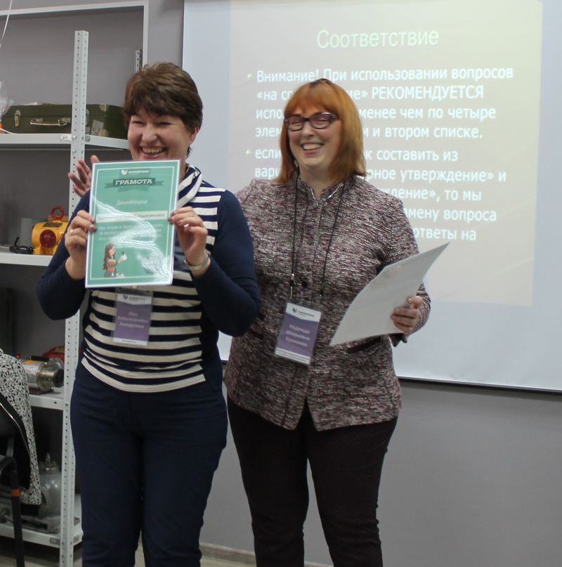 Практическая часть тренинга позволила апробировать свои возможности по созданию субъективных тестов (на оценку знаний, умений, компетенций); проективных тестов (на оценку устойчивых компетенций, состояний и мотиваций); тестов на выявление специфических компетенций. Преподавательский состав отметил необходимость данного обучения для их работы. Развитие на базе учебного центра тестовых площадок, новых методик оценки знаний и системы дистанционного обучения позволит им формировать курсы обучения более интересном, нестандартном формате, более точно и правильно строить тестовые задания и кейсы для более качественной оценки знаний и компетенций обучающихся. Решили совместно с преподавателями, чтобы не потерять полученные знания на тренинге, в конце года, по уже заведенной традиции принять участие в семинаре преподавателей учебного центра и представить свои наработки по тестированию по своему курсу обучения. По результатам обучения преподавателям выданы сертификаты.