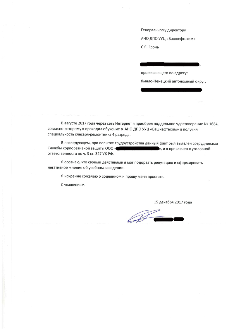 Ответственность за подделку документа об образовании18 января 2018Очень часто в наш адрес поступают запросы о подтверждении подлинности того или иного документы об образовании. К сожалению, в последнее время увеличился поток поддельных удостоверений, якобы выданных нашим учебным центром. Мошенники на различных интернет-ресурсах утверждают, что покупка документа об образовании без прохождения обучения абсолютно законна и ничем не грозит покупателю. Конечно же, это не так. Вы не только останетесь без денег, доверившись мошенникам, но и рискуете стать фигурантом уголовного дела, как этот мужчина, приславший в наш адрес такое письмо:
