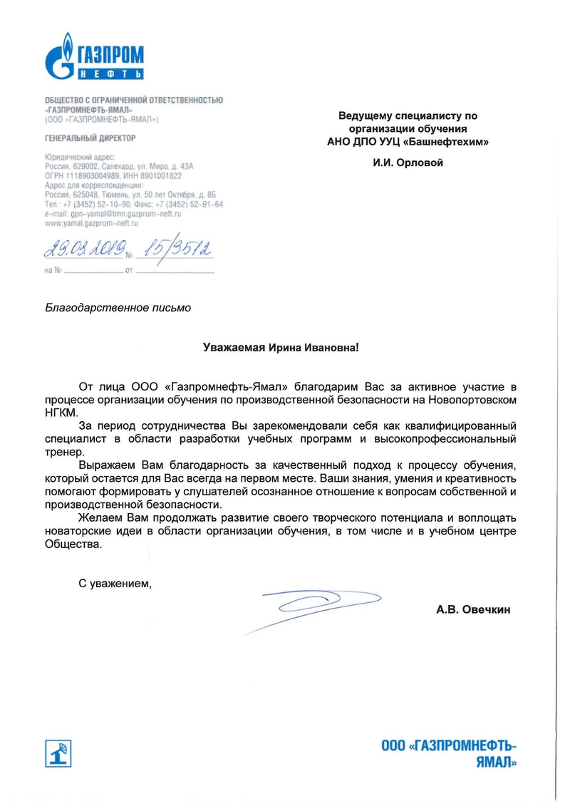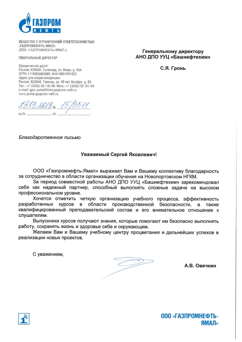 ООО «Газпромнефть-Ямал» выразило благодарность учебному центру «Башнефтехим» за сотрудничество в области проведения обучения3 апреля 2019В адрес генерального директора Сергея Гронь и коллектива учебного центра «Башнефтехим» поступило письмо, в котором выражается благодарность за сотрудничество в области организации и проведения обучения на объекте ООО «Газпромнефть-Ямал» - Новопортовском НГКМ. В документе говорится, что учебный центр «Башнефтехим» за период совместной работы зарекомендовал себя как надежный партнер, способный выполнять сложные задачи на высоком профессиональном уровне. Отмечаются четкая организация учебного процесса, эффективность разработанных курсов в области производственной безопасности, а также квалифицированный преподавательский состав и его внимательное отношение к слушателям. «Выпускники курсов получают знания, которые помогают им безопасно выполнять работу, сохранять жизнь и здоровье себе и окружающим», - подчеркивает в письме генеральный директор ООО «Газпромнефть-Ямал» Алексей Овечкин.