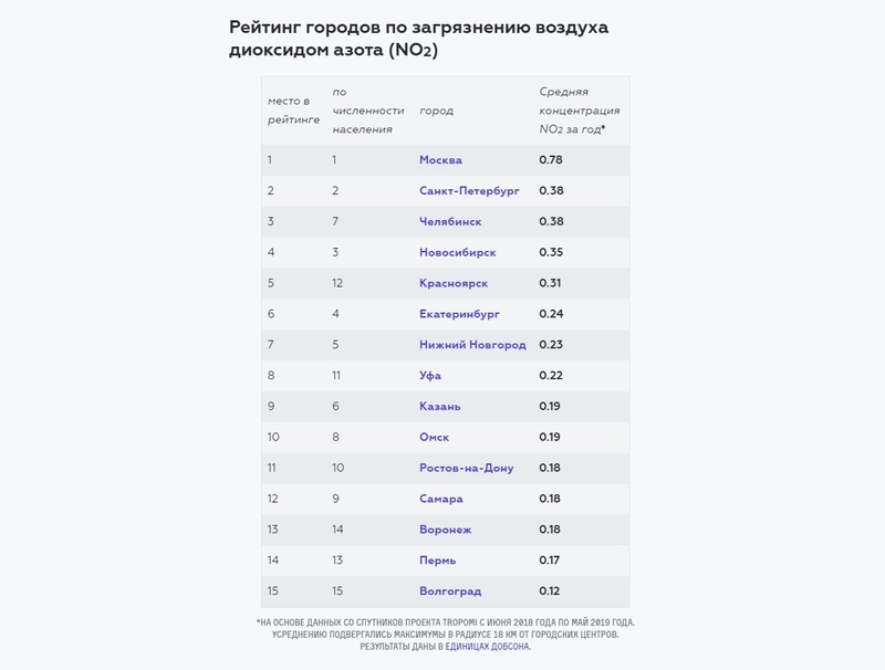 Уфа вошла в ТОП-10 городов по уровню загрязнения воздуха диоксидом азота19 июля 2019Greenpeace составил рейтинг российских городов по загрязнению воздуха диоксидом азота (NO2). Список формировался на основе данных со спутников проекта Tropomi с июня 2018 года по май 2019 года. Рейтинг демонстрирует, в каких крупных городах России сильнее загрязнение воздуха диоксидом азота. Первые три строчки заняли Москва, Санкт-Петербург и Челябинск. Далее идет Новосибирск, замыкает «пятерку» Красноярск. Следом расположились Екатеринбург и Нижний Новгород – шестое и седьмое места соответственно. Восьмая строчка досталась Уфе. За ней следует Казань, закрывает ТОП-10 Омск.