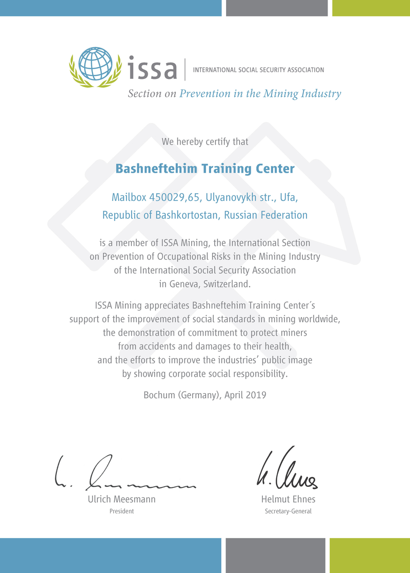 УЦ «Башнефтехим» стал участником ISSA Mining29 апреля 2019Учебный центр «Башнефтехим» стал участником Международной секции ISSA Mining по предотвращению профессиональных рисков в горнодобывающей промышленности. Членство подтверждается соответствующим сертификатом, выданным в апреле 2019 года. В документе отмечается, что ISSA Mining высоко оценивает деятельность учебного центра «Башнефтехим», которая направлена на улучшение социальных стандартов в добывающей промышленности и профилактику производственного травматизма. Членство в ассоциации позволит перенимать международные передовые практики и обмениваться опытом в области охраны труда, промышленной безопасности. Также «Башнефтехим» будет оказывать содействие в продвижении концепции нулевого травматизма Vision Zero и 7 золотых правил (7 golden rules for Vision Zero). Договоренность о вступлении в ISSA Mining была достигнута во время встречи представителей ассоциации и учебного центра.