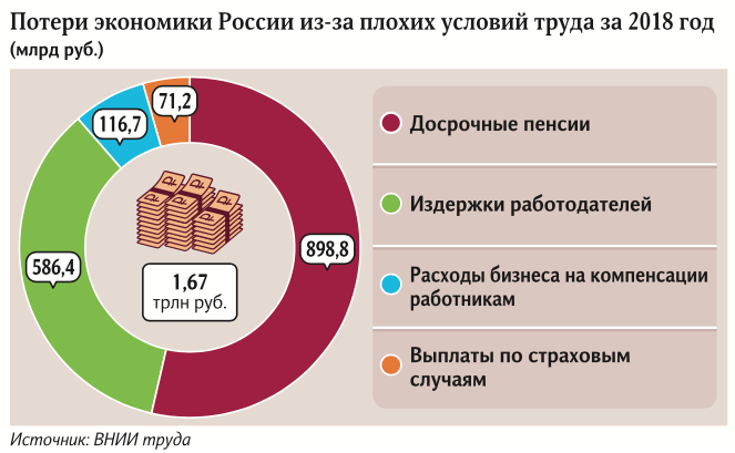 Охрана трудна: из-за травм сотрудников экономика потеряла 1,67 трлн рублей31 октября 2019Потери российской экономики из-за несоблюдения норм охраны труда составили 1,67 трлн рублей, или 1,6% ВВП страны. Такие данные по итогам 2018 года представлены в материалах ВНИИ труда (подведомственное учреждение Минтруда) к одному из совещаний, с ними ознакомились «Известия». Больше процента ВВП — довольно солидная сумма, особенно с учетом выполнения президентской задачи по вхождению России в число крупнейших экономик мира, говорят эксперты. Властям стоит постараться свести такие издержки к минимуму, однако достичь нулевого уровня будет невозможно, утверждают специалисты. Под потерями из-за несоблюдения норм охраны труда специалисты в основном подразумевают последствия производственных травм (они могли быть получены и по вине работодателя, и из-за неосторожности самого сотрудника) и плохие условия труда (например, в шумном или душном помещении производительность большинства людей падает), следует из материалов института. После несчастного случая работник может уйти на больничный или даже на пенсию, а при вредных или опасных условиях труда сотрудникам положены доплаты и сокращенный рабочий день. Связанные с этим расходы и издержки несут как сами компании, так и государственные социальные структуры. В частности, в прошлом году Пенсионный фонд России (ПФР) потратил 898,8 млрд рублей на выплату досрочных пенсий людям, работавшим на вредных производствах, а Фонд социального страхования (ФСС) выплатил 71,2 млрд рублей по страховым случаям (например, больничным), указано в материалах ВНИИ труда. Как указали специалисты института, работодатели потратили 116,7 млрд рублей на компенсации сотрудникам плюс недополучили 586,4 млрд рублей выручки из-за потерь рабочего времени (и, следовательно, снижения производства продукции или услуг). Суммарно экономические потери, связанные с состоянием условий и охраны труда в России, в 2018 году составили 1,67 трлн рублей, или 1,6% ВВП, заключили специалисты ВНИИ труда. «Известия» направили запросы в пресс-службы Минтруда и ВНИИ труда. В 2016 году заместитель министра труда и соцзащиты России Григорий Лекарев заявлял, что экономика России ежегодно теряет из-за неудовлетворительных условий труда порядка 1,6 трлн рублей, или 2,3% ВВП. Таким образом, можно сделать вывод, что за эти годы сумма потерь практически не изменилась, а ВВП вырос.