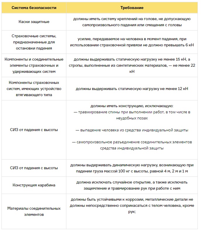 Именно по причине этих изменений на все высотные работы требуется назначать ответственного руководителя работ, разрабатывать ППР, выдавать наряд-допуск и проводить целевой инструктаж каждого члена бригады, кроме этого применять системы обеспечения безопасности работающих: ограждения, страховочные привязи или другие средства коллективной защиты, указанные в ППР Изменение № 6. Уточнили сертификацию систем обеспечения безопасности и спасения По новым правилам, подлежит обязательной сертификации на ТР ТС 019/2011 еще и анкерное устройство. Теперь работодатель может организовать работы на высоте при наличии действующего сертификата соответствия Техническому регламенту таможенного союза 019/2011 на системы безопасности. Таблица. Каким требованиям должны отвечать системы безопасности