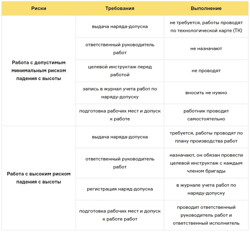 Давайте посмотрим, чем отличаются мероприятия по обеспечению безопасности в зависимости от риска падения с высоты: Таблица. Требования к работам на высоте в зависимости от уровня риска