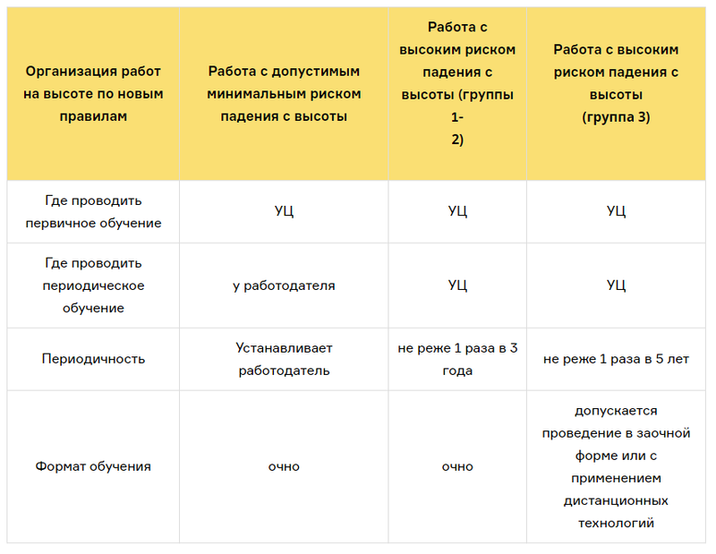 Работодатель, исходя из результатов оценки рисков, может принять решение дополнительно обучить работников на группы работ на высоте с высоким риском падения, особенно для сотрудников, выполняющих подъем на высоту со средств подмащивания в условиях высокого риска падения и получения травм. Поэтому необходимо скорректировать и утвердить заново перечень работ с повышенной опасностью, проводимых по наряду-допуску. Обучение по новым правилам работ на высотеВ связи с вступлением в силу новых правил, специалисту по охране труда необходимо организовать и проконтролировать проведение внепланового инструктажа на рабочем месте и внеочередной проверки знаний требований охраны труда. Внимание! Учебные центры, обучающие на 1 и 2 группу работ на высоте, обязаны иметь учебно-тренировочные полигоны.