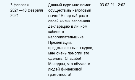На сегодня интерес к этим темам проявили более 70 человек, а полностью изучили их и прошли итоговое тестирование 16 пользователей. 3 февраля поступил отзыв о том, как пригодился курс «Повышение финансовой грамотности». В своем комментарии пользователь рассказывает, как помогли полученные знания об индивидуальных инвестиционных счетах.