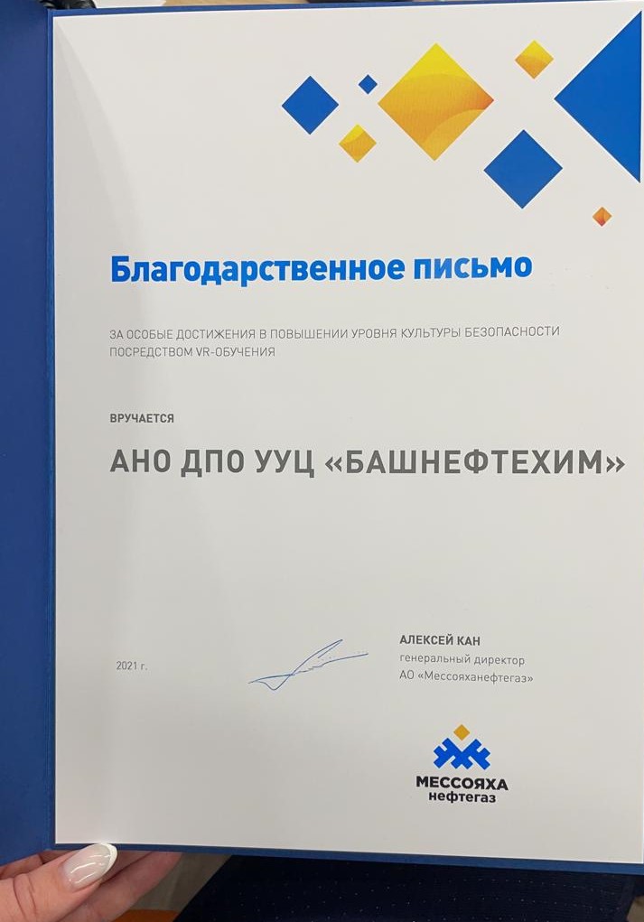 Успехи тренеров «Башнефтехима» в VR-обучении работников отмечены руководством АО «Мессояханефтегаз»19 марта 202110 марта АО «Мессояханефтегаз» провело информационную онлайн-сессию с бизнес-партнерами. Встреча была посвящена результатам деятельности в области промышленной безопасности в 2020 году и планам на 2021 год. Учебный центр «Башнефтехим» дистанционно представляли генеральный директор Алексей Шеин и ведущий специалист по организации обучения Айгуль Бахарева. На мероприятии обозначался вклад компаний-партнеров в развитие культуры безопасности на производстве. Проведение VR-курсов тренерами учебного центра «Башнефтехим» отмечено благодарственным письмом АО «Мессояханефтегаз». Документ подписал генеральный директор Алексей Кан. В письме отмечаются особые достижения в повышении уровня культуры безопасности посредством VR-обучения.
